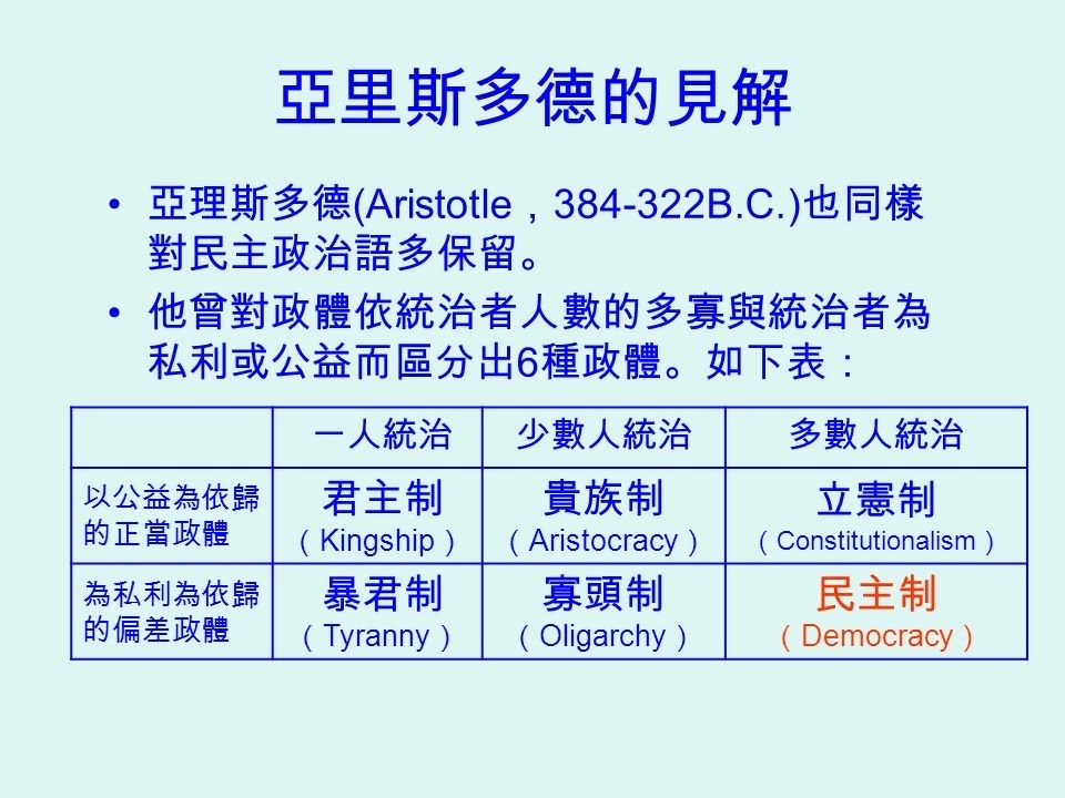 (C)統治者的人數以及統治基於個人或社會整體的利益