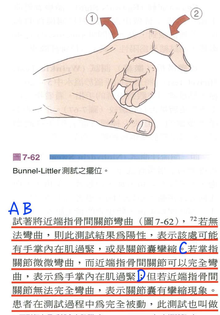 (D)掌指關節彎曲情形下,近端指間關節無法彎曲,關節囊攣縮為原因之一