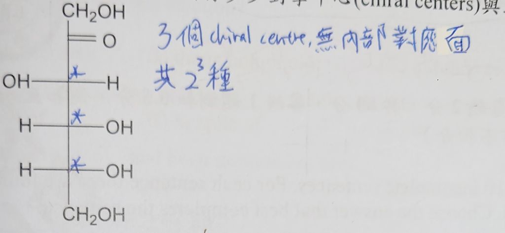 45. 下圖果糖(D-fructose)結構中,共有多少對掌中心(chiral centers)與立體異構物(stereoisomers)?