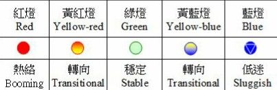 景氣對策信號亦稱「景氣燈號」,係以類似交通號誌方式的5種不同信號燈代表景氣狀況的一種指標,目前由貨幣總計數M1B變動率等9項指標構成。每月依各構成項目之年變動率變化(製造業營業氣候測驗點除外),與其檢查值做比較後,視其落於何種燈號區間給予分數及燈號,並予以加總後即為綜合判斷分數及對應之景氣對策信號。景氣對策信號各燈號之解讀意義如下:若對策信號亮出「綠燈」,表示當前景氣穩定、「紅燈」表示景氣熱絡、「藍燈」表示景氣低迷,至於「黃紅燈」及「黃藍燈」二者均為注意性燈號,宜密切觀察後續景氣是否轉向。