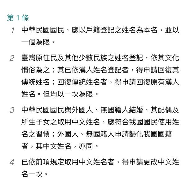 姓名條例第1條第3項規定,中華民國國民與外國人、無國籍人結婚,其配偶及所生子女之取用中文姓名,應符合我國國民使用姓名之習慣;外國人、無國籍人申請歸化我國國籍者,其中文姓名,亦同。