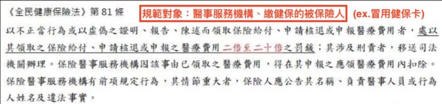 因為相關法條中並沒有明確指出關於冒用健保卡的文字敘述,所以不太清楚怎麼判斷冒用健保卡是罰二到二十倍的處分(我覺得是十倍金額) 希望有高手說明QQ