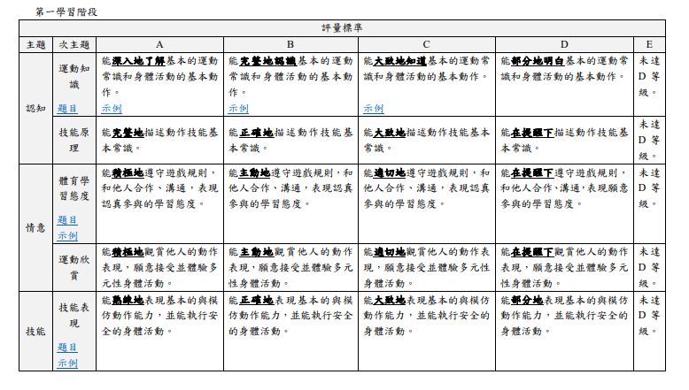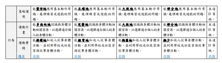 47. 十二年國教課綱國民中小學標準本位評量標準,在第一學習階段之行為主題與運動實踐次主題並對應學習表現指標下:當學生「能持