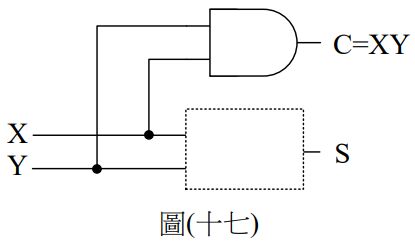 47. 如圖(十七)所示之半加法器邏輯電路,其中 X 為被加數,Y為加數,S 為和,C 為進位輸出。試問虛線處應使用何種邏輯閘方能使電路正確工作?