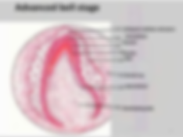 ①此時為帽蓋期(cap stage) ②此時為鐘形期(bell stage) ③箭頭所指為牙本質(dentin) ④箭頭所指為造牙本質母細胞層 (odontoblast layer)