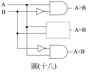 48. 如圖(十八)所示為一位元數值比較器電路,兩個輸入為A與B,三個輸出分別代表A>B、A=B與A<B。當輸入A>B成立時,輸出 A>B端之訊號為1,其餘為0;當輸入A<B成立時,輸出 A<B端之訊號為 1,其餘為0。今欲使輸入 A=B時,輸出A=B之腳位為1,其餘為 0,則虛線處可使用下列何種邏輯閘使電路正確工作?