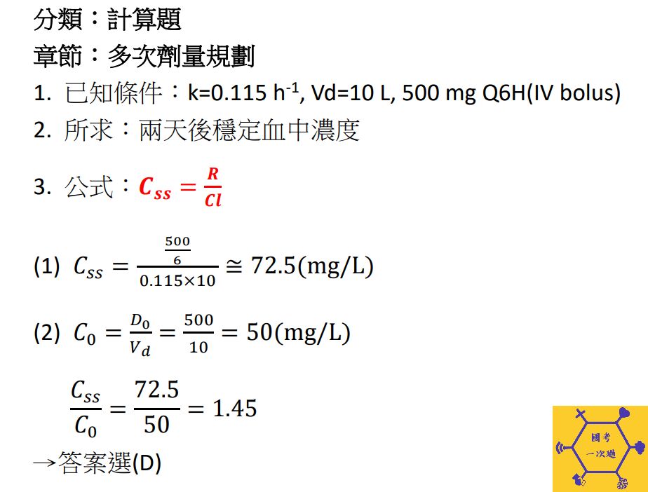 ,分布體積10 L。現以靜脈注射500 mg Q6H給病人,經過2天後,其平均血中濃 度約是第一次給藥初濃度(Co)的若干倍?