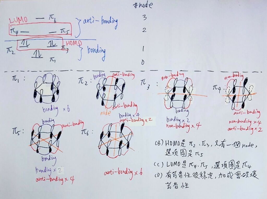 (A) 苯環的碳上有六個 p 軌域可組合成六個 π 軌域