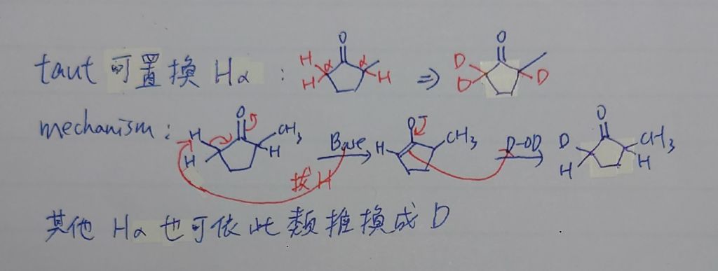 49. 當 2-甲基環己酮(2-methylcyclohexanone)與過量的重水(D2O)進行鹼催化,每一分子的 2-甲基環己酮 有多少氫原子會被置換成氘原子?