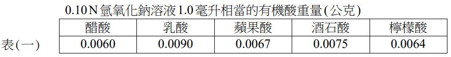 49. 葡萄汁20.0毫升加水稀釋至100.0毫升,取此稀釋果汁50.0毫升,以0.10 N氫氧化鈉溶液 ( F = 1.0 )滴定,滴定體積為5.0毫升,0.10 N氫氧化鈉溶液 1.0毫升相當的有機酸克數如表(一)所示,此葡萄汁的有機酸含量為多少%?