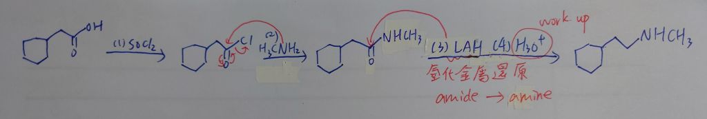 RCOOH(羧酸)→RCOCl(醯氯)→RCONHMe(2級醯胺)→RCH2NHMe(2級胺)