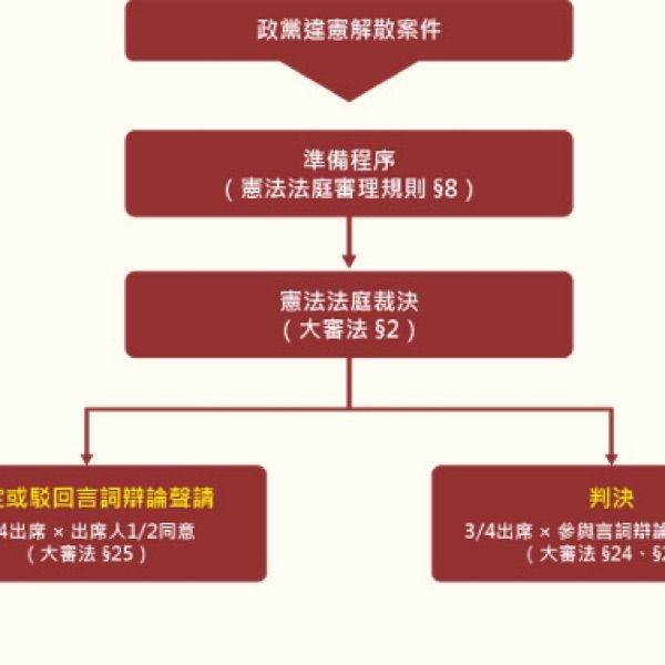 一、依憲法增修條文第五條第四項規定,司法院大法官組成憲法法庭,審理政黨違憲之解散事項。