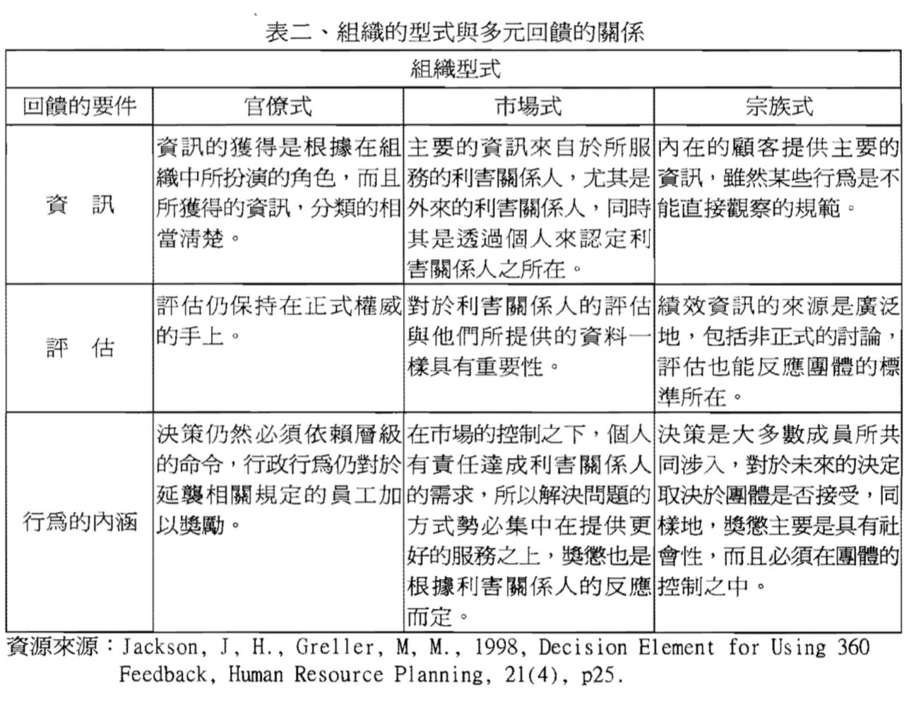 在多元回饋績效評估中,下列何種組織型式,其主要的資訊來自所服務的利害關係人?