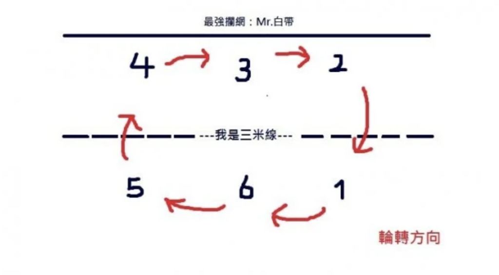 5.排球比賽當接發球隊取得發球權時,需依什麼方向做輪轉?