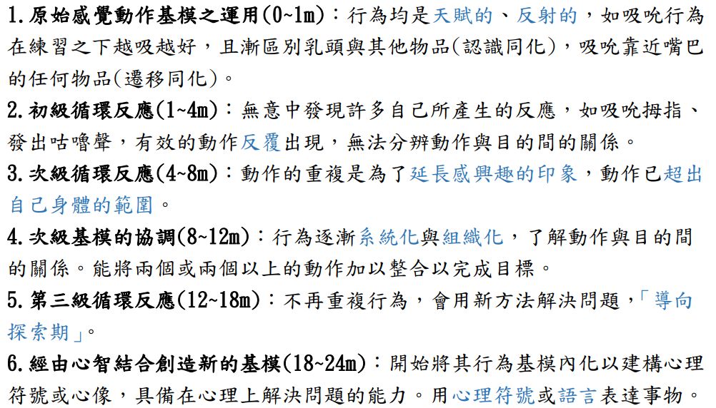 反射動作期(0~1個月):行為均是天賦、反射,如吸吮行為。 初級循環反應(1~4個月):無法分辨動作與目的關係,如吸吮手指頭。 次級循環反應(4~8個月):此期動作重複是為感興趣的印象延長,如抓取和玩弄伸手可觸及之物。 次級基模的協調(8~12個月):已熟悉的動作達到目的且開始模仿周遭事物。 第三級循環反映:(12-18個月):不再重複行為,會使用新的方法解決問題,故稱導向探索期。 心智整合(18~24個月):利用心裡符號或語言表達事物