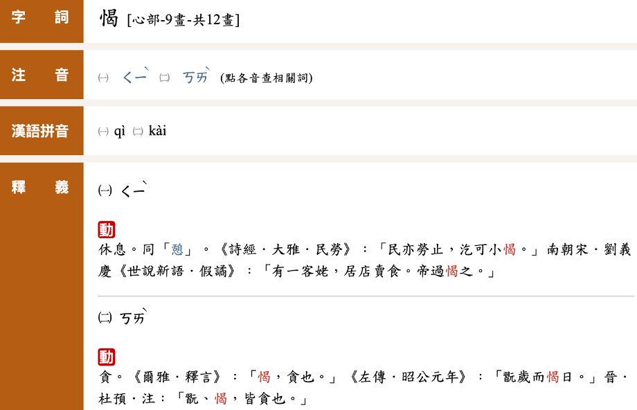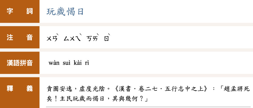 5. 《左傳.昭公元年》:「翫歲而愒日。」此乃「玩歲愒日」成語的原典之一。此處的「愒」字,其義為何?