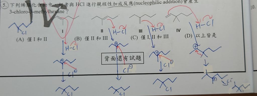 5. 下列烯類化合物中,何者與 HCl 進行親核性加成反應(nucleophilic addition)會產生 3-chloro-3-methylhexane?