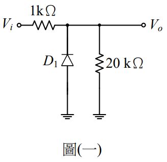 5. 如圖(一)所示的電路,若輸入\( V_i(t) = 10\sin(377t) \) V,則輸出\( V_o(t) \)的最大值\( V_{o\max} \)和最小值\( V_{o\min} \)分別為何?