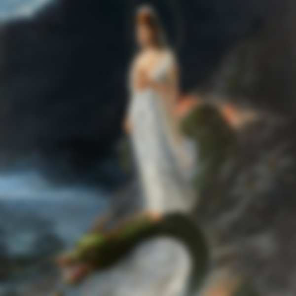 《騎龍觀音》是原田 1890 年的彩色油畫作品,高 272 公分、寬 181 公分,尺寸巨大,展現其對歐洲寫實主義和傳統繪畫研究的成果。觀音像置於中央,與週遭環境包括飛舞的龍構成栩栩如生的畫面,給人一種如電影場景般的真實感。