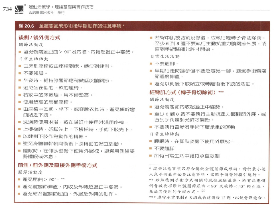 50.有關全髖關節置換術術後物理治療的禁忌,下列何者錯誤?