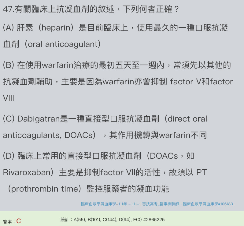 (C)即使 Thrombin clotting time 正常,仍無法排除病人目前的凝血功能 異常源自於 Dabigatran 的可能性。
