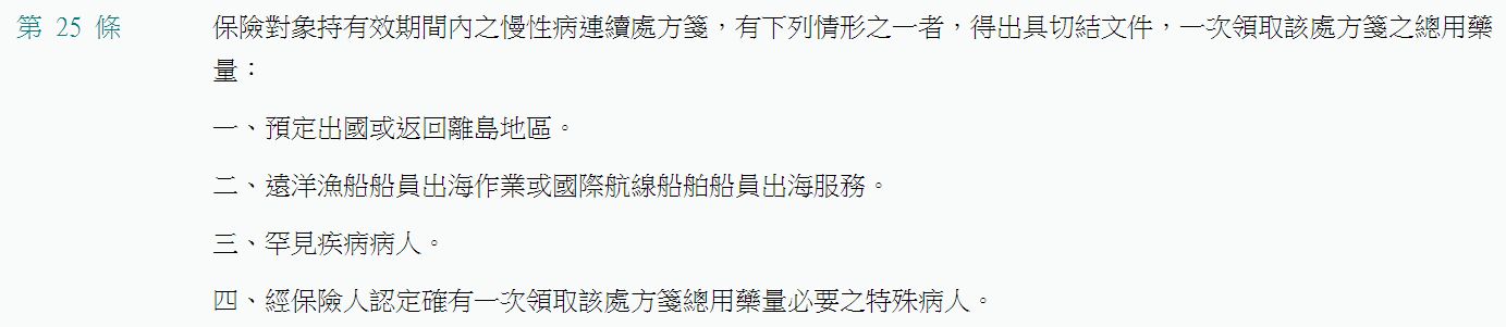 四、經保險人認定確有一次領取該處方箋總用藥量必要之特殊病人。