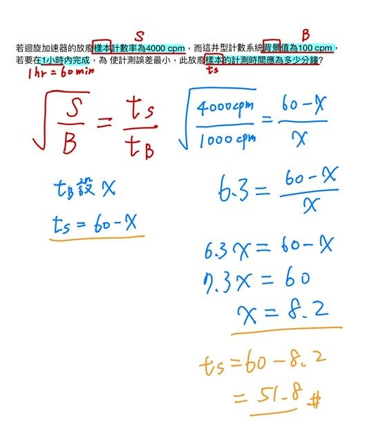 50.若迴旋加速器的放廢樣本計數率為4000 cpm,而這井型計數系統背景值為100 cpm,若要在1小時內完成,為 使計測誤差最小,此放廢樣本的計測時間應為多少分鐘?