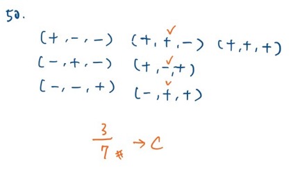 50. 擲三個公正的銅板一次,在至少出現一個正面的條件下,恰好出現兩個正面的機率為何?