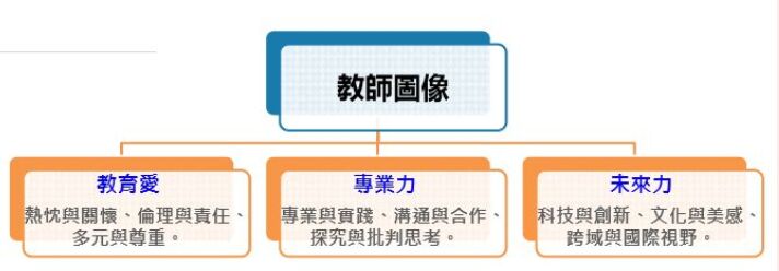 教師圖像:專業力(國際觀、批判思考、問題解決);教育愛(洞察、關懷、熱情);執行力(創新、合作、實踐)