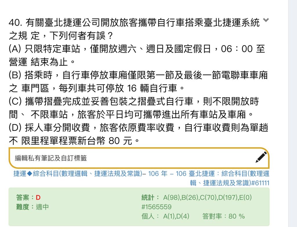 50. 有關臺北捷運公司開放旅客攜帶自行車搭乘臺北捷運系統之規定,