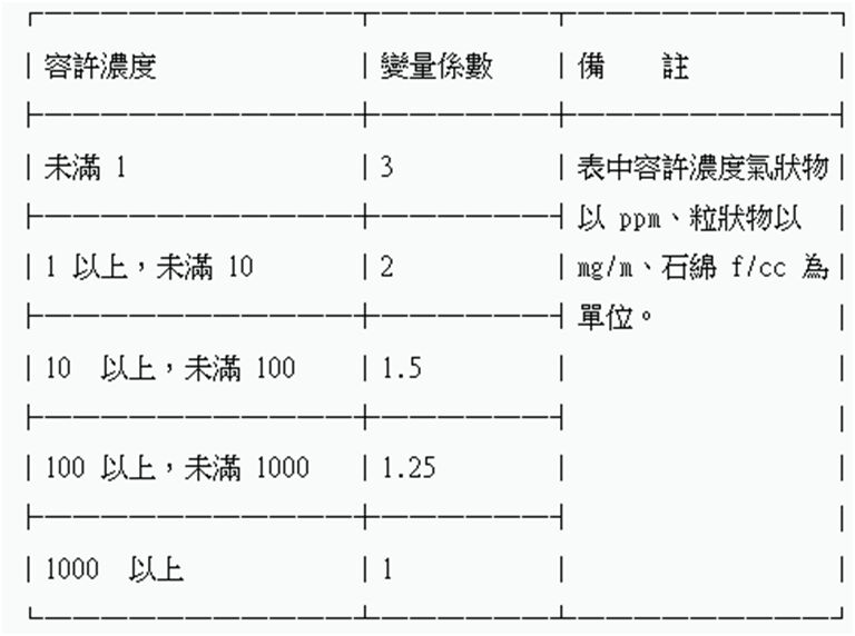 三氯乙烯之八小時日時量平均容許濃度為50ppm(269mg/m3),其變量係數為1.5,則其短時間時量平均容許濃度為50*1.5=75