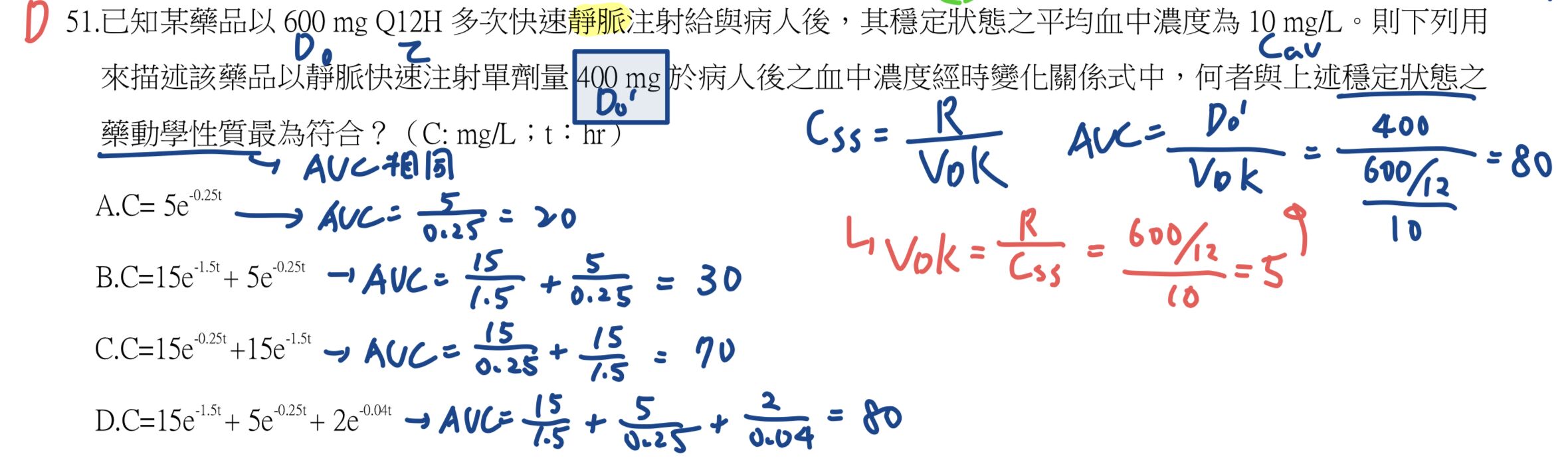由1. 可得Cl=5,再帶入2. (D/Cl=AUC),AUC應為80。找AUC = 80的選項。
