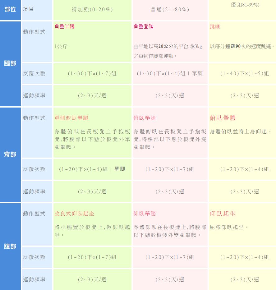 中有一組運動是「負重登階、俯臥舉腿及仰臥舉腿」。請問老師要加強小冬的那一種體適
