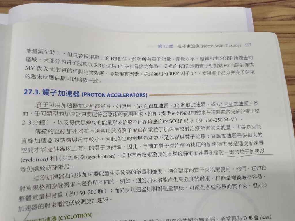 放射治療物理學p.527質子可用加速器加速到高能量,例如直線加速器,迴旋加速器,同步加速器,目前也正在發展電漿粒子加速器