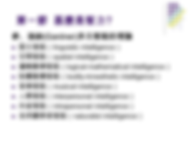 l Gardner分析出的八種智能〔美(空間)、國(語文)、數、社(人際)、體(肢體動覺)、自、反、音→美國宿舍體制反英〕