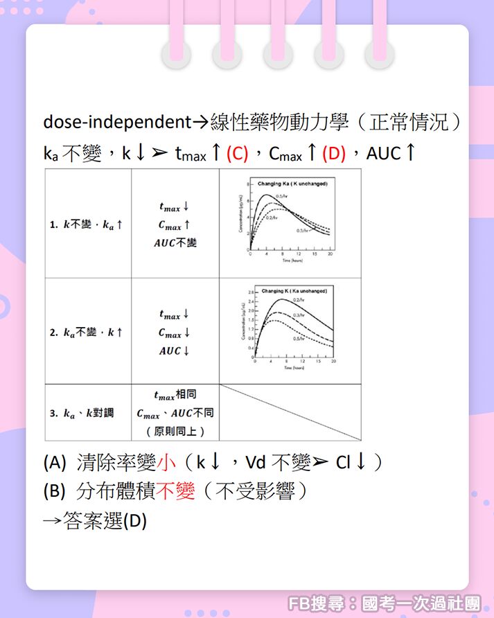 1.假如我是吸收速率的情況,排除速率變小。沒人管我,我就可以慢慢吸收Tmax大,而且排除變小那代表吸收進身體的藥物都還留著,Cmax大,排除慢,藥就繼續留在身體,AUC大