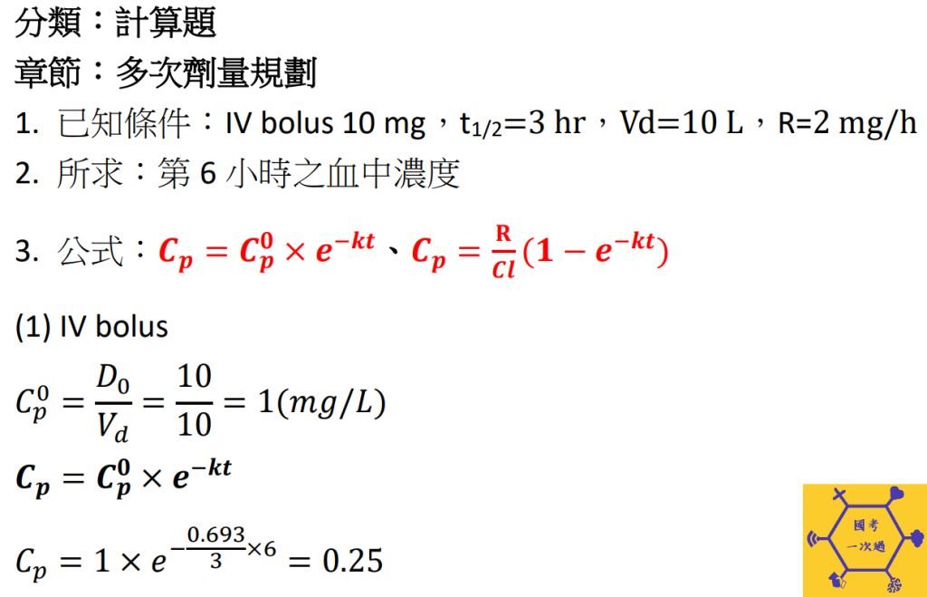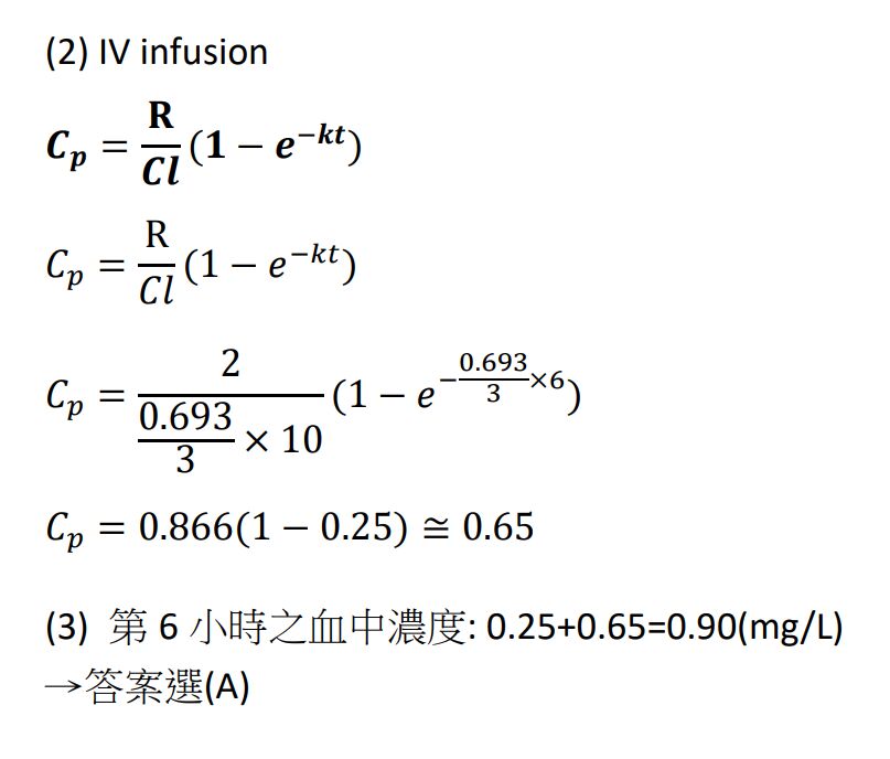 55.陳小姐同時接受某藥物單次 10 mg 靜脈注射及 2 mg/h靜脈輸注,已知此藥物之半衰期為3小時,體內分布體積 為10 L。開始給藥後第6小時之血中濃度為若干mg/L? (