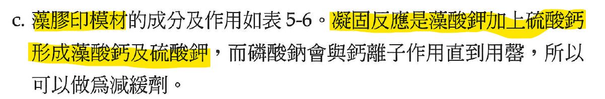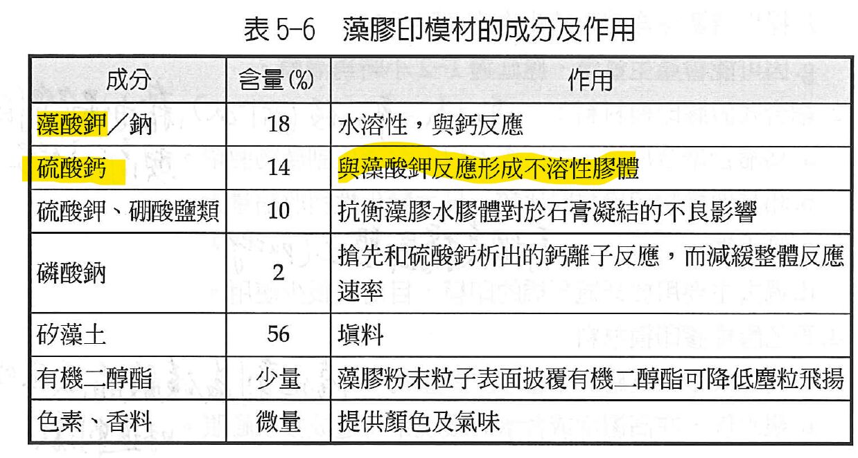 藻膠的成分內有藻酸鉀和硫酸鈣。藻膠的硬化就是藻酸鉀和硫酸鈣反應成為藻酸鈣和硫酸鉀。 而石膏粉就是硫酸鈣會改變藻膠內的硫酸鈣濃度,加速硬化的反應。
