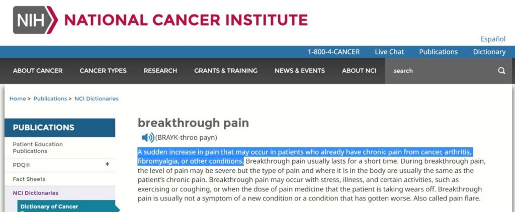 在癌症人群中,突破性疼痛一詞通常是指在病人使用鴉片類藥物控制的慢性疼痛情況下,短暫的疼痛發作(出處:ncbi)