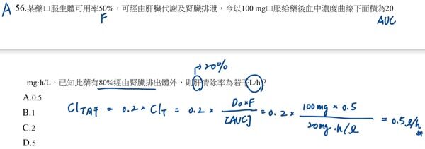 56.某藥口服生體可用率50%,可經由肝臟代謝及腎臟排泄,今以100 mg口服給藥後血中濃度曲線下面積為20 mg‧h/L,已知此藥有80%經由腎臟排出體外,則肝清除率為若干L/h?