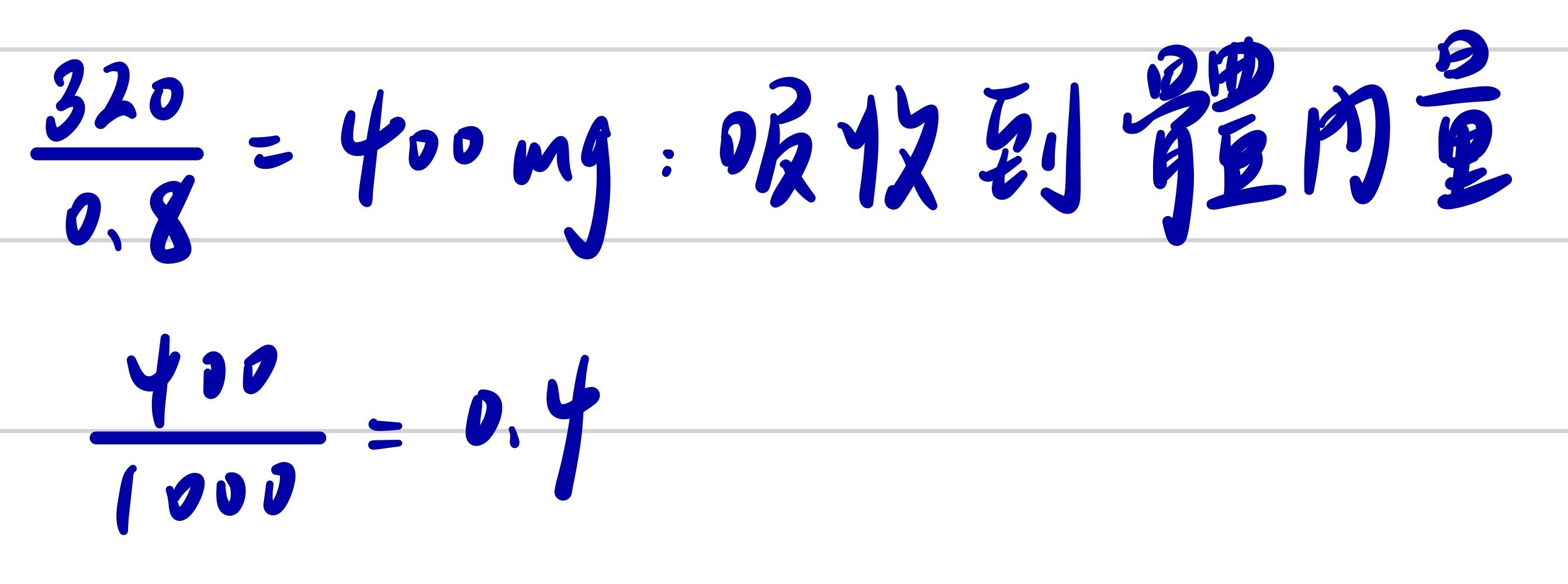 56.某藥品口服給與 1 g 後,於尿液中原型藥之總排泄量為320 mg。已知其血漿蛋白未結合分率(fu)為 0.5,且此藥以原型由尿液排泄分率為 0.8。則此藥口服生體可用率約為若干?