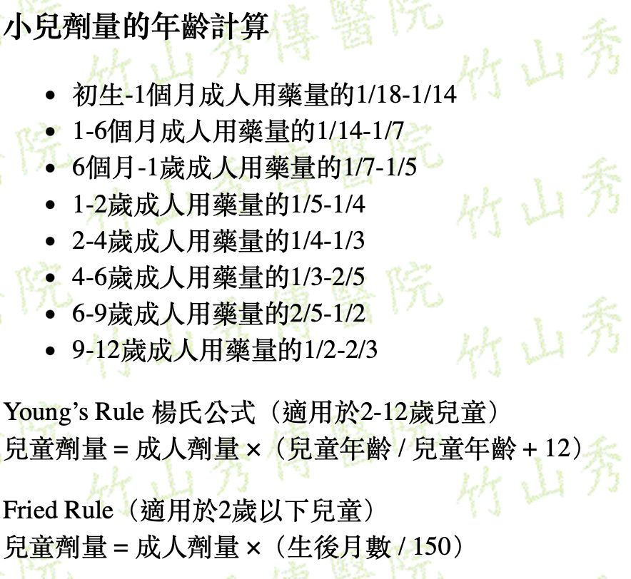 | Young’s rule | 2y-12y | (年齡/(年齡+12)) *成人劑量 | |