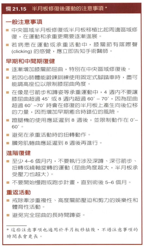 57.有關膝關節半月板修補(meniscus repair)術後的運動原則與注意事項,下列敘述何者正確?