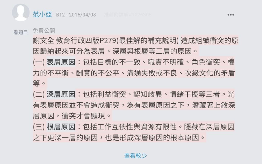 57. 組織衝突的原因中,下列哪一個屬於深層原因?