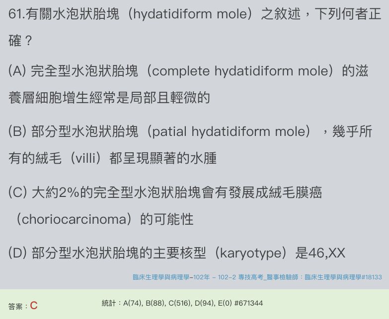 (C)部分胎塊(partial mole)較容易變成絨毛膜癌(choroicarcinoma)
