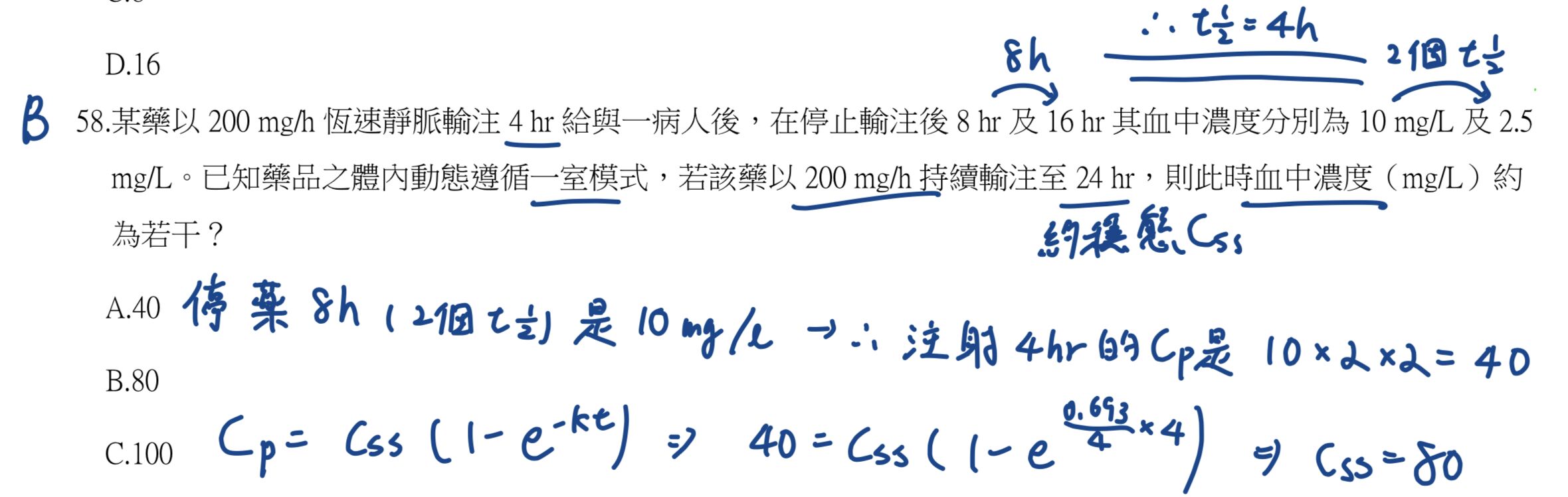 58.某藥以 200 mg/h 恆速靜脈輸注 4 hr 給與一病人後,在停止輸注後 8 hr 及 16 hr 其血中濃度分別為 10 mg/L 及 2.5 mg/L。已知藥品之體內動態遵循一室模式,若該藥以 200 mg/h 持續輸注至 24 hr, 則此時血中濃度(mg/L)約 為若干?