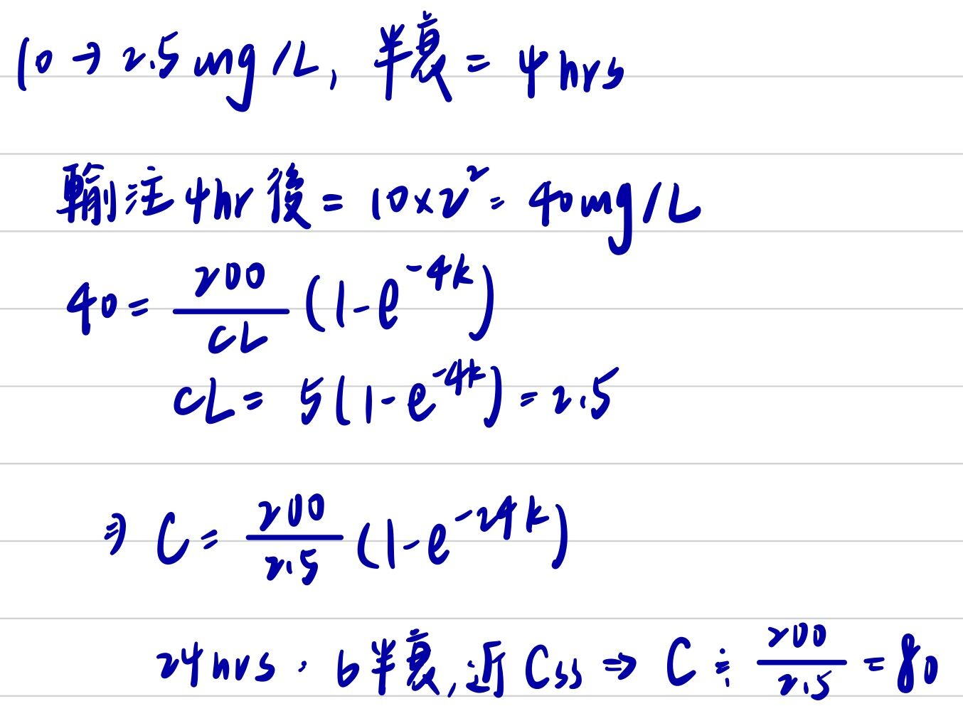 題幹以300 mg/h的速率,求Css,Css=48 mg/L× 2=96 mg/L