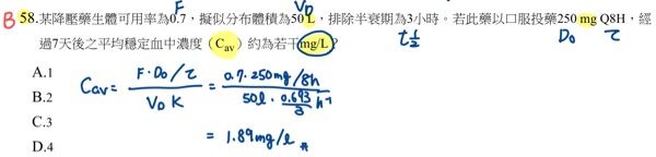58.某降壓藥生體可用率為0.7,擬似分布體積為50 L,排除半衰期為3小時。若此藥以口服投藥250 mg Q8H,經 過7天後之平均穩定血中濃度(