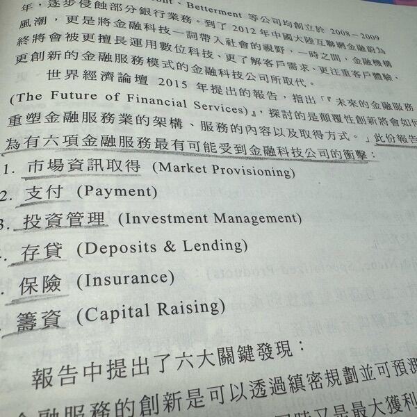 針對 2015 世界經濟論壇(WEF)曾提到「最易受金融科技公司」衝擊的「六項金融服務」:支付/保險/存貸/籌資/投資管理/市場資訊供應