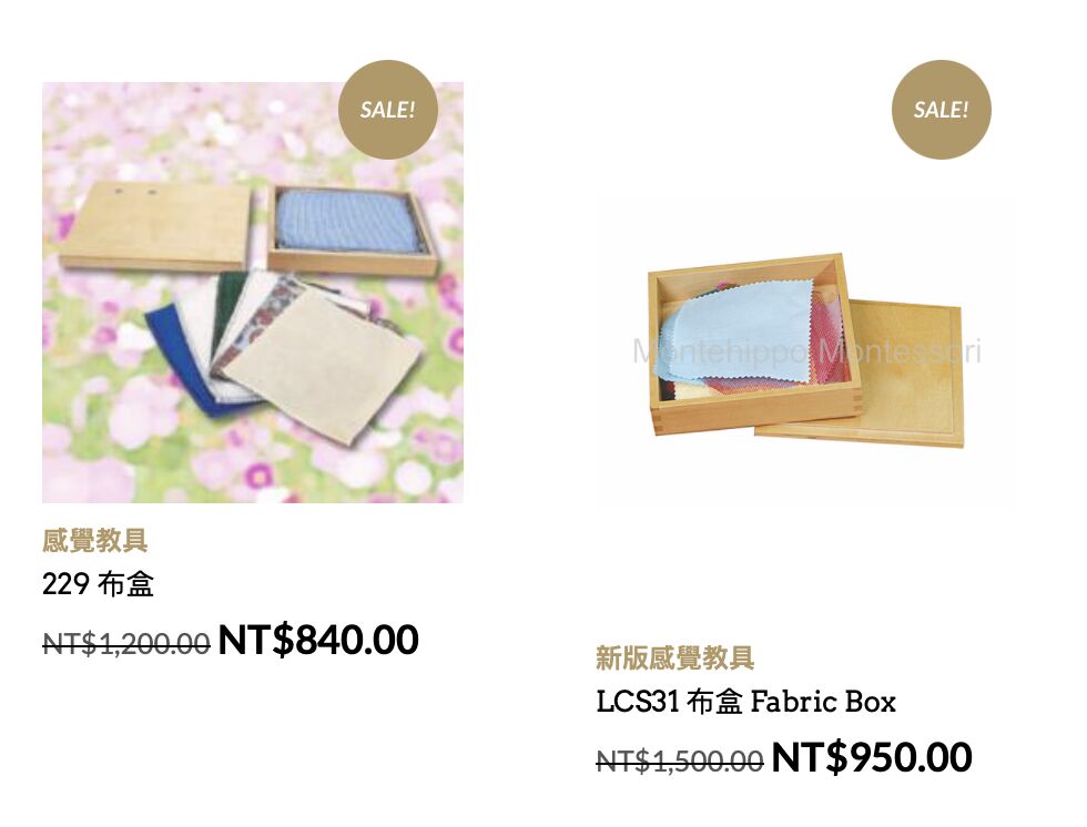 感官教具:包含視覺、觸覺、溫覺、重量覺、色覺等不同的感官教具,也有結合兩種或兩種以上感覺的教具。